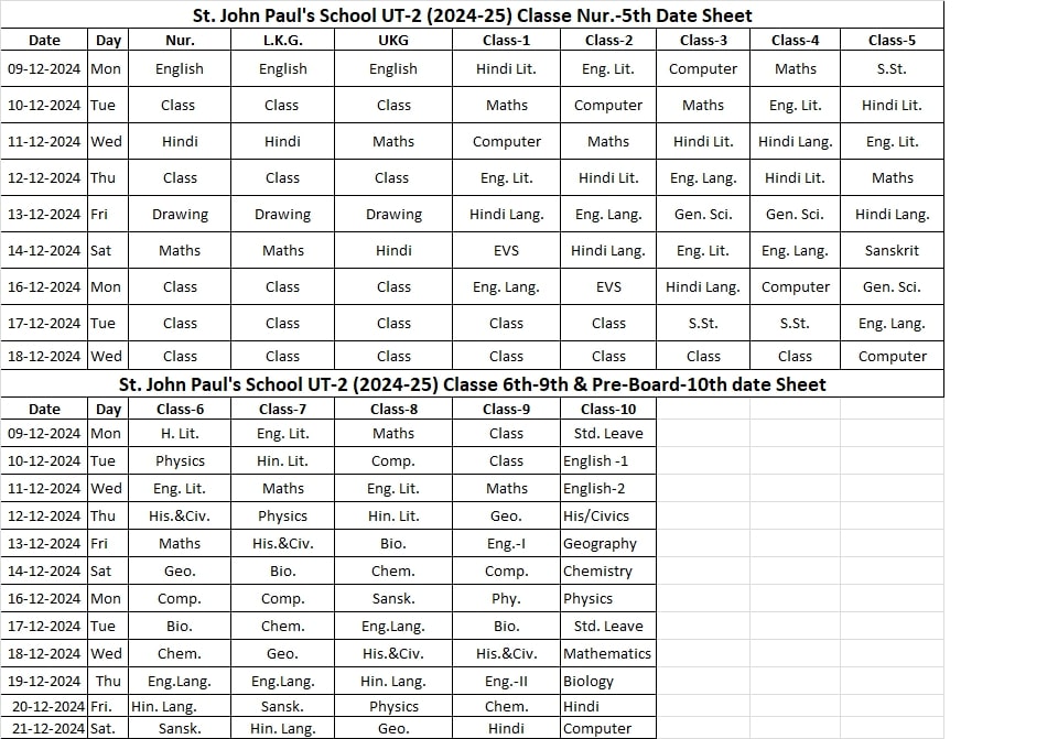 Unit Test-II & Pre Board Date Sheet